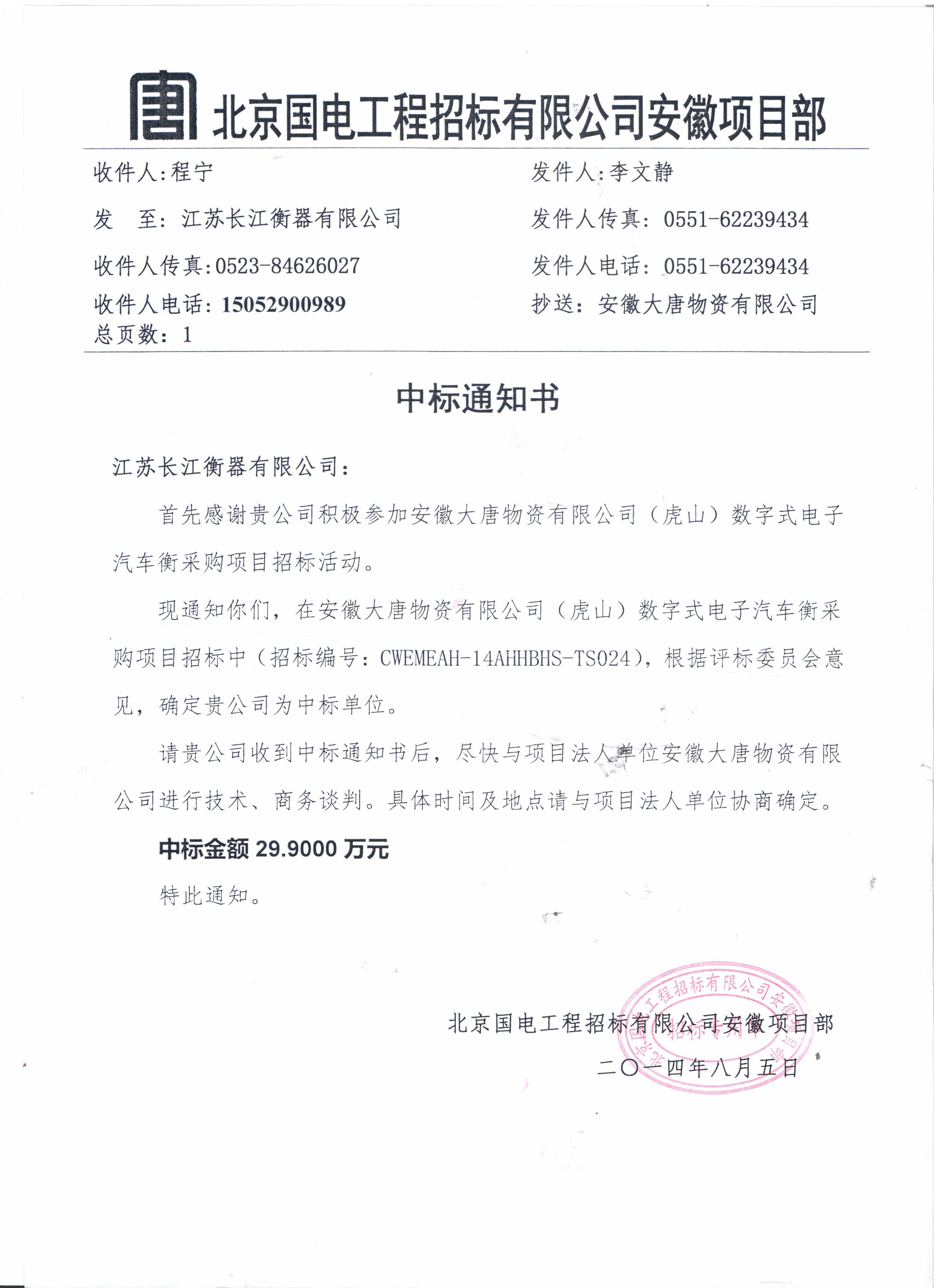 我公司很榮幸參加了北京國電工程招標公司安徽項目部舉行的安徽大唐物資有限公司(虎山)數(shù)字式電子汽車衡的招標,我公司榮幸中標!