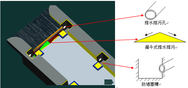 秤體頭尾部分與引道縫合不好,會形成一定縫隙。塵土、垃圾會通過縫隙落入秤體底部。同時,污水也會通過縫隙流入秤體底部,若秤體底部排泄設(shè)施未處理好,將造成稱重傳感器被污水侵泡,直接影響產(chǎn)品質(zhì)量。針對此特殊環(huán)境,充分考慮了排泄措施,免除了將秤體吊起清污排水的麻煩。(如下圖)