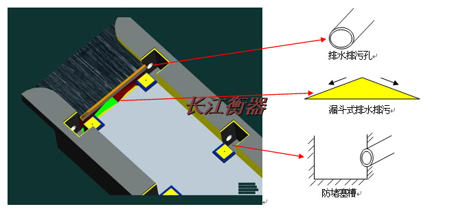 地磅秤體頭尾部分與引道縫合不好,會(huì)形成一定縫隙。塵土、垃圾會(huì)通過(guò)縫隙落入秤體底部。同時(shí),污水也會(huì)通過(guò)縫隙流入秤體底部,若秤體底部排泄設(shè)施未處理好,將造成稱重傳感器被污水侵泡,直接影響產(chǎn)品質(zhì)量。針對(duì)此特殊環(huán)境,充分考慮了排泄措施,免除了將秤體吊起清污排水的麻煩。(如下圖)
